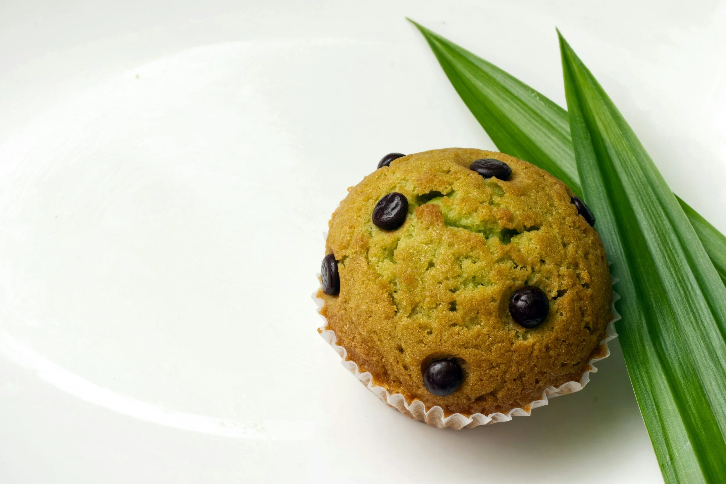 • Green cupcake with chocolate chips and pandan leaf on a white plate.